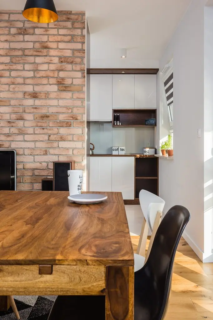 Partitia care separa vizual bucataria de living este placata cu caramida, creand textura si culoare la nivelul decorului. Este un soi de punct de interes menit sa atraga atentia. Accesoriile si decoratiunile, precum corpurile de iluminat, covorul, tablourile personalizeaza discret fiecare functiune in parte.