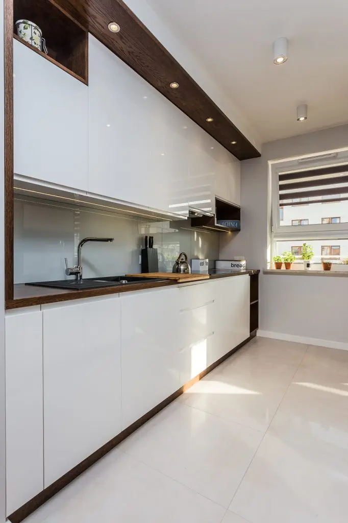 Bucataria pastreaza si ea linia minimalista abordata. Fronturile albe, lucioase ale mobilierului reflecta lumina si amplifica spatiul. Designul simplu, manerele frezate sprijina caracterul unitar al amenajarii. Electrocasnicele sunt incorporate intr-un mod functional, iar blatul de lemn si suportul pentru spoturi completeaza de minune albul imaculat al dulapurilor.