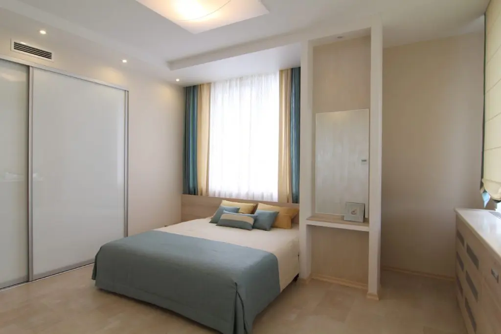 In cele doua dormitoare, accente subtile de turcoaz si rosu se strecoara printre tonurile dominante de culori calde, accentuate de albul peretilor.