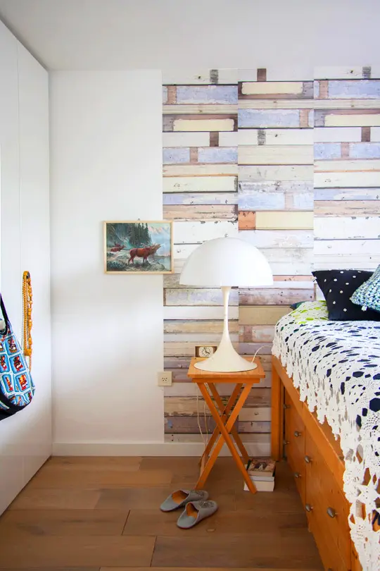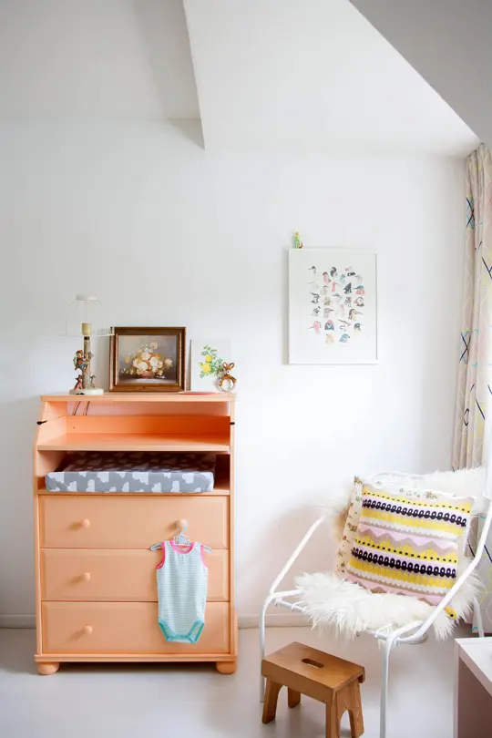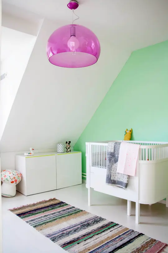 Chiar si mesele auxiliare prezente in living au fost alese cu multa grija si afectiune. Aceasta masa vintage colorata in roz pastel inveseleste orice colt de camera. Camera copilului este perfecta prin simplitatea pe care o emana. Un perete verde-menta adaposteste decorul si mobilierul in stil scandinav. Dormitorul cuplului pastreaza aceeasi cromatica asaltata de culoare si o reprezinta aici printr-un tapet plasat pe peretele din spatele patului. Colturile peretilor au fost decorate in mod magic cu diverse tablouri inspirate din povestile copilariei.