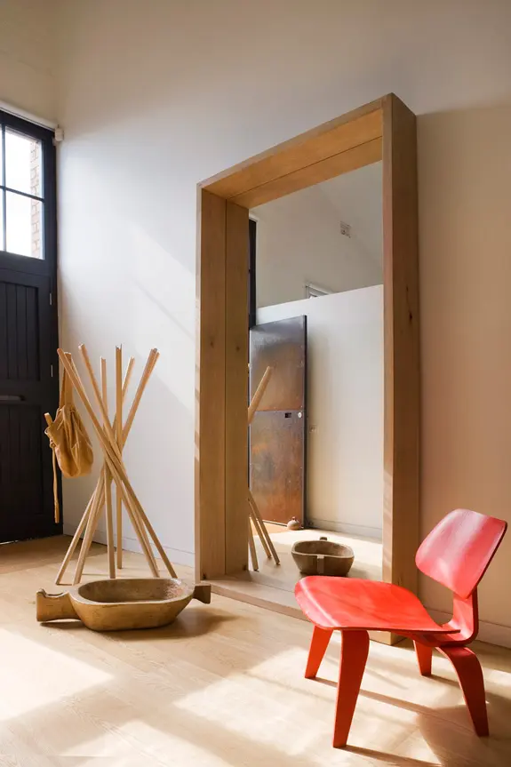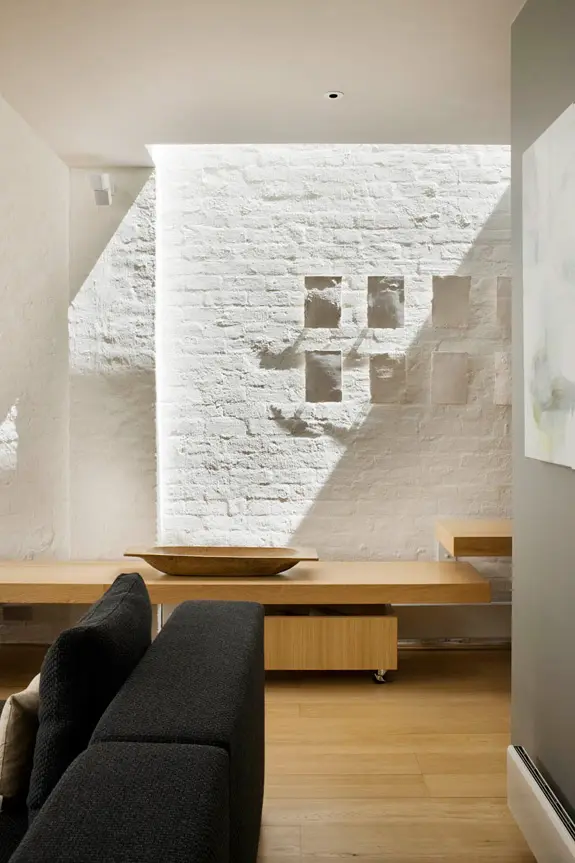 Modernitatea isi pune puternic amprenta prin tablouri si prin sculpturi perfect inglobate in camerele largi, deschise si puternic luminate natural. Din loc in loc, au renuntat la netezimea peretilor imaculati si au ales sa pastreze textura naturala a caramizilor pe suprafete reduse pentru a crea puncte focale pentru anumite obiecte sau colturi de incapere. Baile pastreaza aceeasi caramida, varuita in alb, completata de geamurile tip solz care asigura o aerisire excelenta. Stilul abordat in grupurile sanitare este unul minimalist, o continuare fireasca a restului casei.