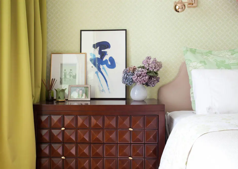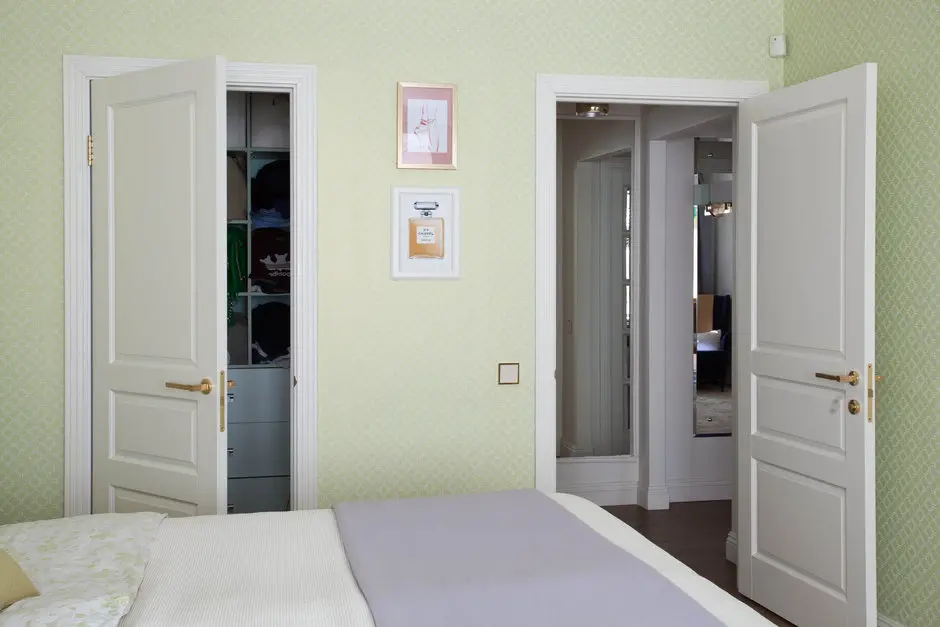 Dormitorul ne imbie cu nuante de verde si multe texturi si imprimeuri. Spatiul este luminos, verdele fiind astfel pus in valoare. Este o camera placuta, odihnitoare si in plus, functionala (vezi zona de dressing). Un spatiu pentru lucruri voluminoase sau haine groase a fost amenajat si in hol, chiar langa dormitor.
