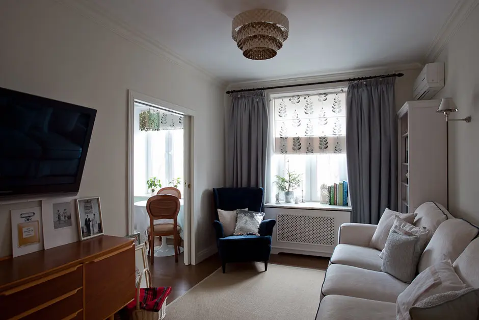 Pentru living, amenajarea pastreaza o simetrie prin cele doua corpuri de biblioteca dispuse de o parte si cealalta a canapelei. Fotoliul albastru asezat la fereastra paote fi locul perfect pentru lectura. Ca sa pastreze tonalitatea in spirit clasic a amenajarii, Olga a ales sa adauge o masca pentru a ascunde aspectul inestetic al caloriferului, largind in acelasi timp pervazul (excelent suport pentru carti, plante sau alte decoratiuni). Pentru a nu fragmenta prea mult spatiul apartamentului si a pastra continuitatea amenajarii, designerul a ales sa foloseasca acelasi tip de parchet pentru toate camerele, exceptie facand baia.
