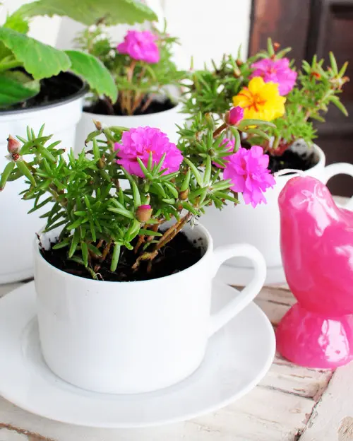 Alegeti plante cu flori colorate, cu dimensiuni mici pentru a incapea eficient in cesti. E bine ca marimile cestilor sa varieze, pentru mai multa diversitate. Le puteti muta mai usor prin casa sau aseza cu usurinta pe pervazul ferestrei sau in balcon.