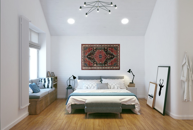 Baia de la parter pentru oaspetiScarile care duc la etaj – un spatiu personalizat cu multe tablouriSpatiul de la etaj contine si un loc amenajat ca un colt de lecturaDormitorul principal amenajat intr-un stil pur scandinav cu elemente de originalitate cum ar fi carpeta orientala care vine ca o aditie interesanta pentru spatiu