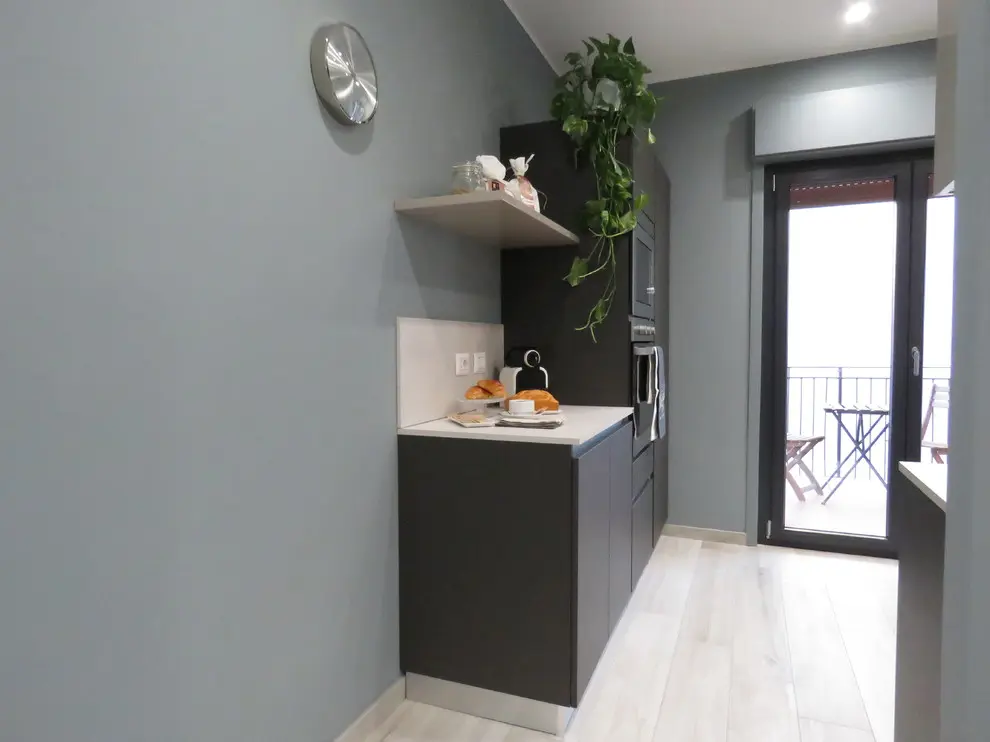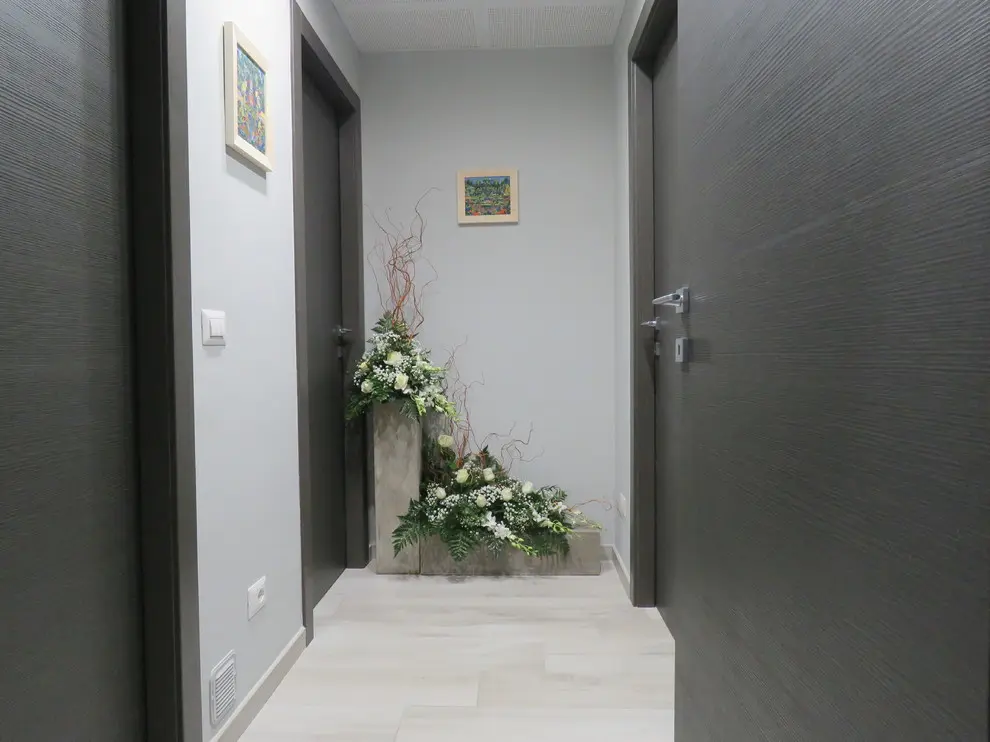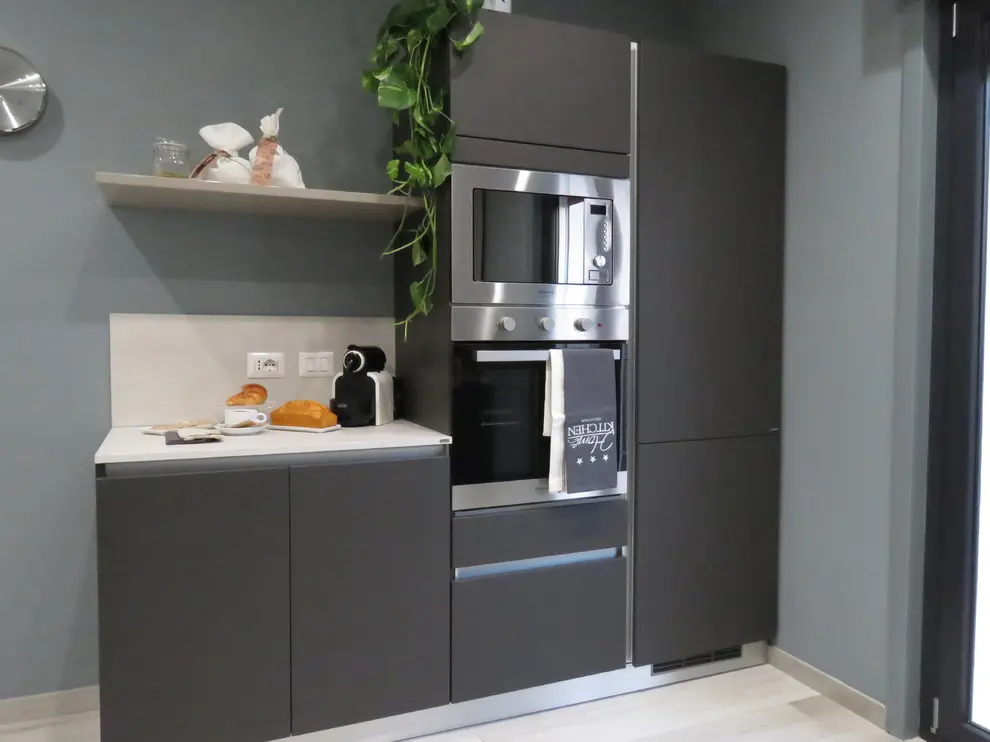 Pentru bucatarie, designerul a mizat pe o dispunere a celor trei zone de lucru pe trei laturi diferite, fiecare cu spatiile de depozitare aferente. Astfel, pe o latura vom gasi chiuveta si picuratorul aferent deasupra, pe latura din apropiere, plita si sertarele cu dulapurile unde sunt depozitate tigai, oale si ustensilele necesare gatitului, iar pe partea opusa, zona cu frigiderul si cuptoarele, toate incorporate in corpuri de mobilier. In tot acest spatiu, predomina albul si griul, dulapurile avand fronturi lucioase pentru a reflecta lumina.
