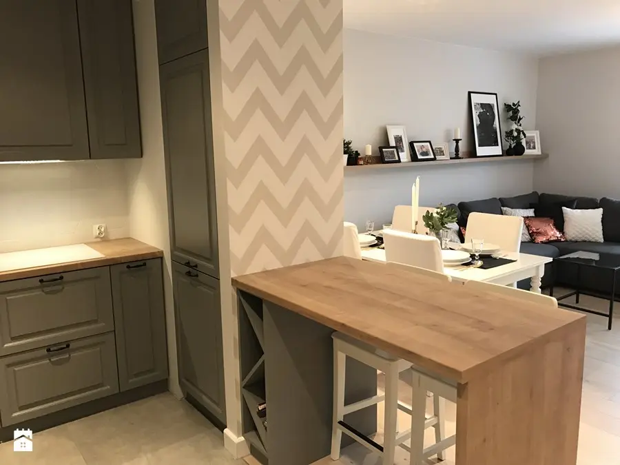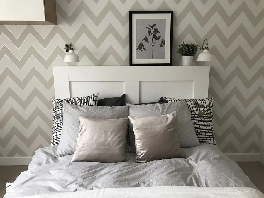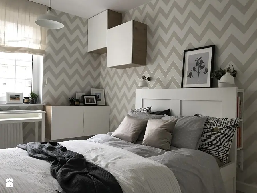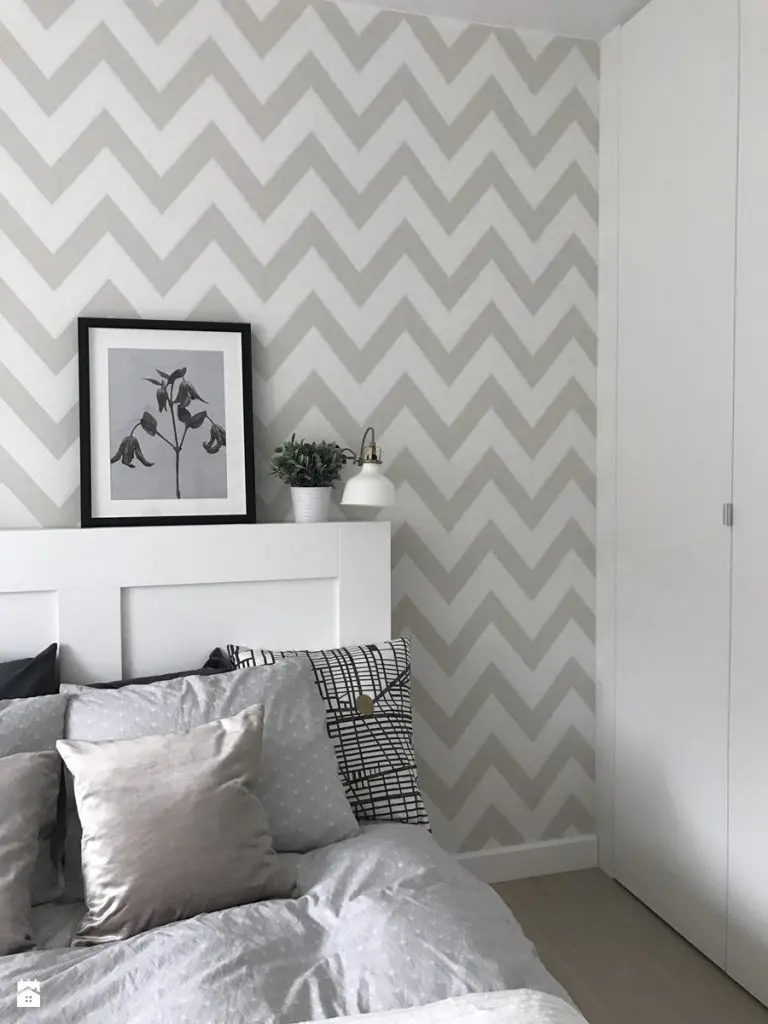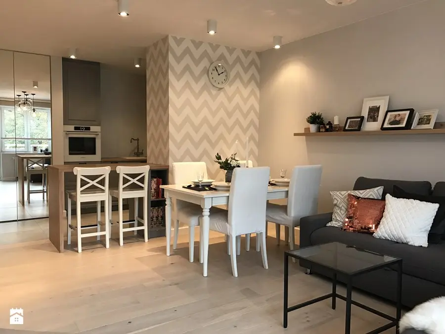 Motivul zigzagului se repeta in amenajare atat in living cat si in zona bucatariei si chiar a dormitorului. Este o metoda simpla de a distrage atentia de la dimensiunile spatiului si in acelasi timp de a crea coerenta la nivelul amenajarii. In cazul acestui apartament, efectul este unul dinamic, iar imprimeul nu perturba decorul, fiind folosit un bej placut.