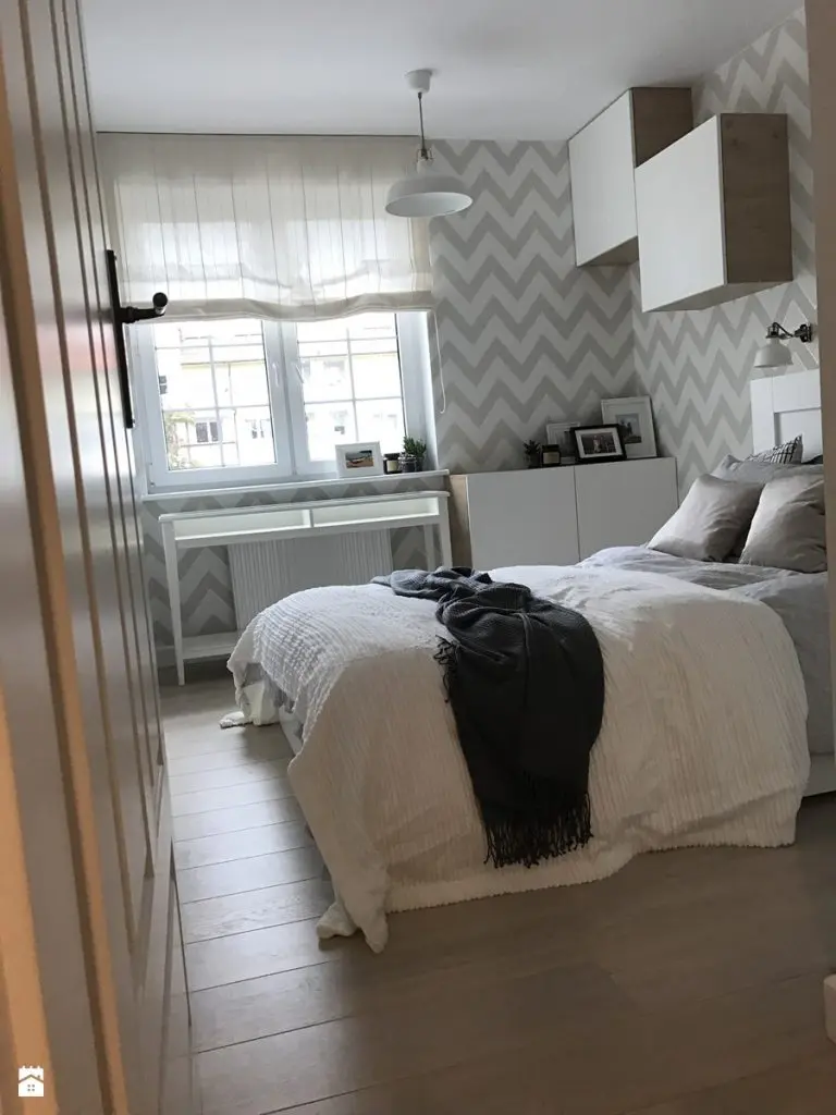 Dormitorul are putin peste 11 metri patrati, dar suficient cat sa ofere loc pentru odihna si spatiu pentru depozitare. Corpurile suspendate atat pe perete in partea superioara cat si langa fereastra preiau locul unei clasice comode ce ar fi ocupat mai mult spatiu decat o fac cele 2 tipuri de dulapuri. In plus, nu exista nici noptiere in sensul clasic, tablia patului preluand rolul lor printr-o nisa ingusta creata in spatele ei. Albul alaturi de nuantele neutre de gri si bej reusesc sa pastreze spatiul luminos si aerisit. De altfel, accentele de gri le vom gasi si in living, bucatarie sau baie oferind un aer contemporan, elegant intregii amenajari.