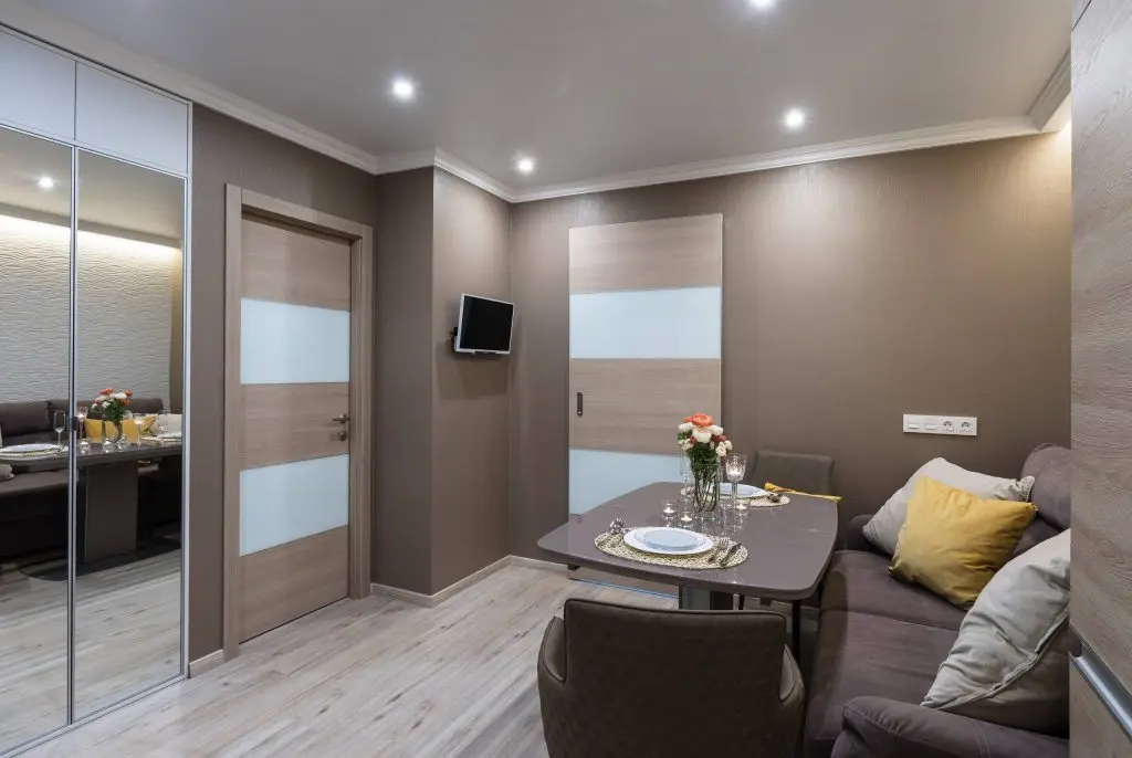 Familia nu si-a dorit nimic complicat, ci doar o amenajare moderna, functionala, care sa fie pe masura nevoilor lor. Astfel, in hol, designerul a creat o zona de depozitare cu dulapuri, paralel dispuse de o parte si cealalta a usii de la prima incapere. Fatetele cu oglinzi sporesc senzatia de marire a spatiului, un truc eficient pentru orice spatiu mic. Surprinzator este faptul ca au montat o oglinda chiar si pe usa de la intrare.