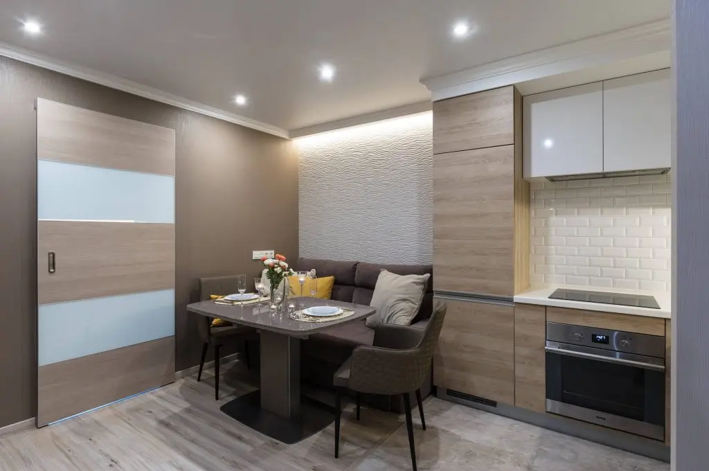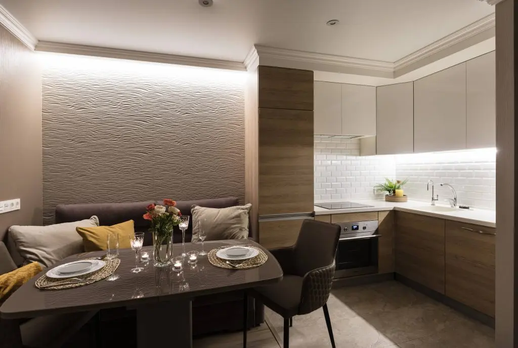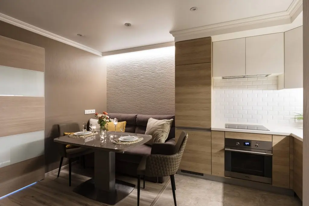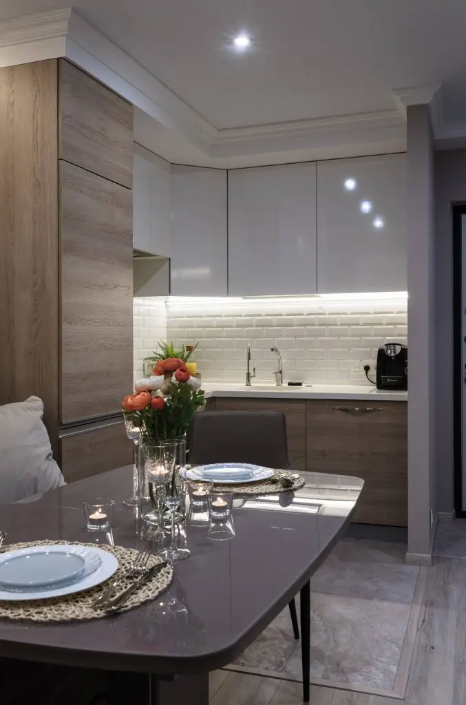 Bucataria a fost amenajata pe doua laturi, minimal, avand electrocasnice incorporate si un brau intre dulapuri creat cu placi ceramice tip metro. Imediat langa zona de gatit se afla spatiul de dining cu o sofa si scaune asezate in jurul mesei. Pe peretele paralel a fost asezat un televizor, aceasta fiind practic zona care aminteste de ideea unui living.