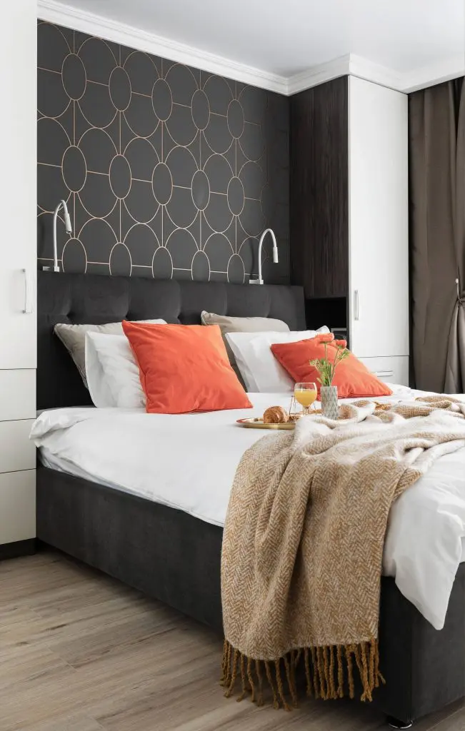 Nevoia de depozitare a fost prioritara in dormitorul parintilor. De aceea, doua dulapuri au fost asezate simetric, de o parte si cealalta a patului. Tapetul ales pentru a contura o zona-accent deasupra patului aduce o nota dramatica decorului.