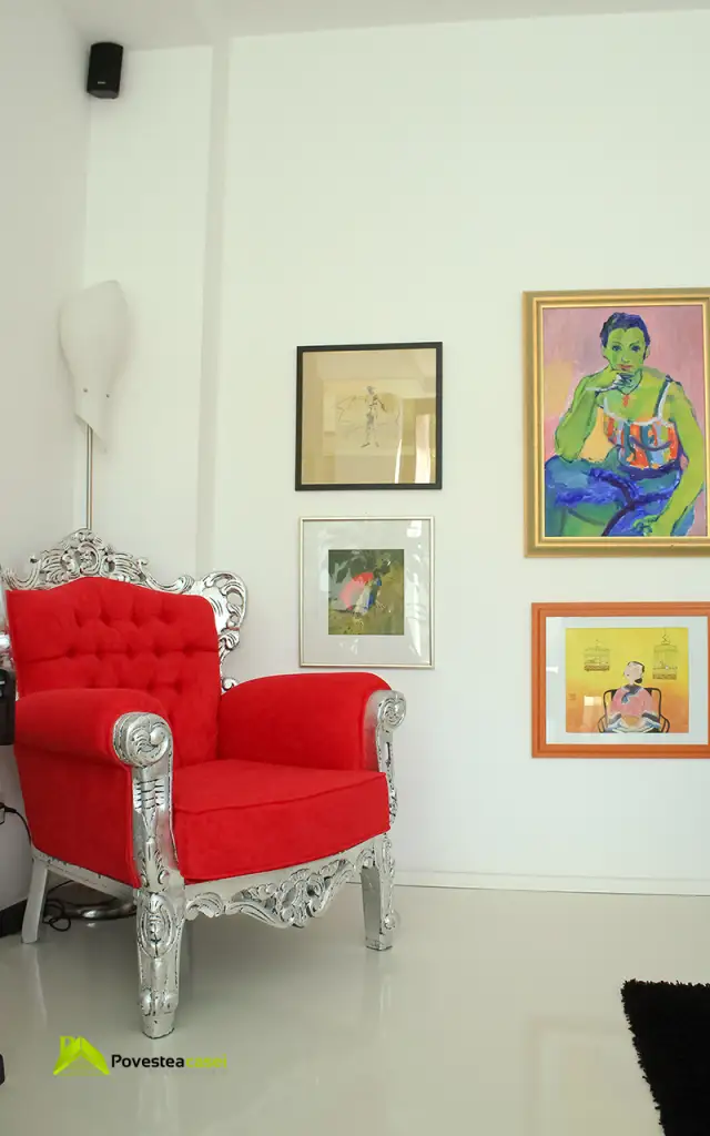 Contemplarea unei colectii personale de arta se face mai bine din confortul unui fotoliu retro din catifea rosie