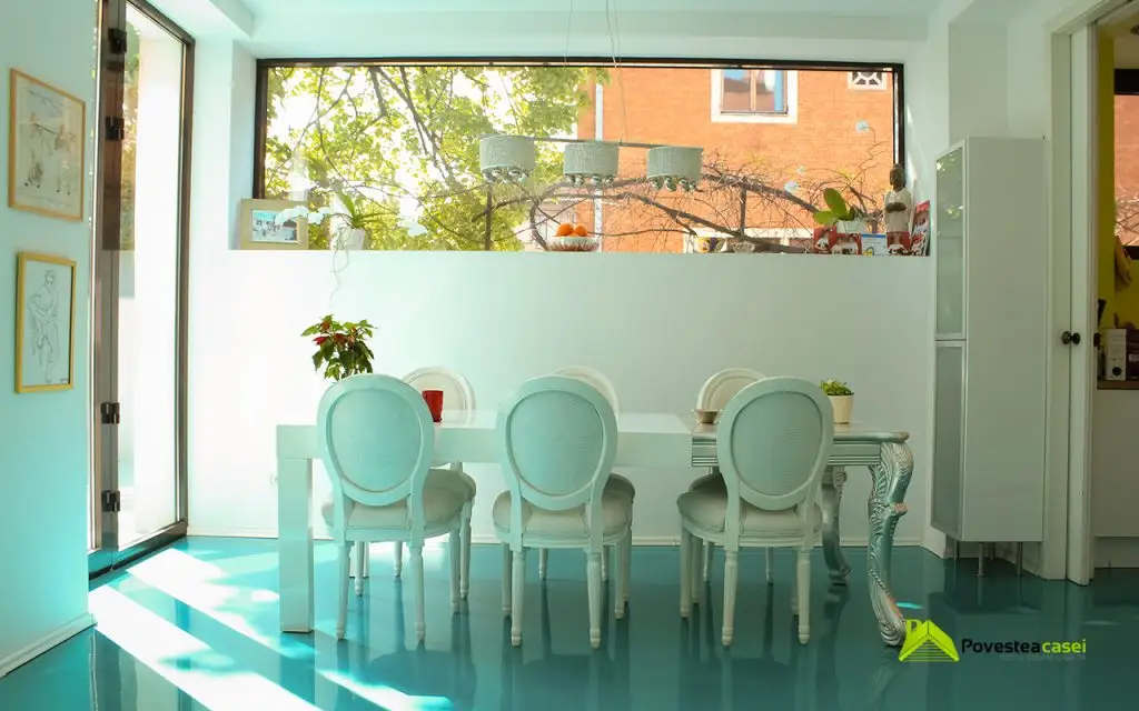 Livingul, amenajat intr-un open space ce isi deschide ochii ferestrelor spre gradina, abunda in culoare – podeaua acvamarin te invita sa uiti de tot ce te-a urmarit peste zi si sa te abandonezi relaxarii, in timp ce jocul texturilor din obiectele de decor iti vor limpezi privirea.