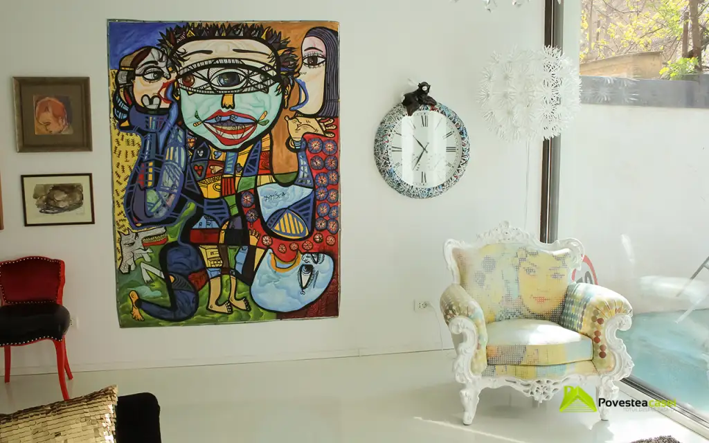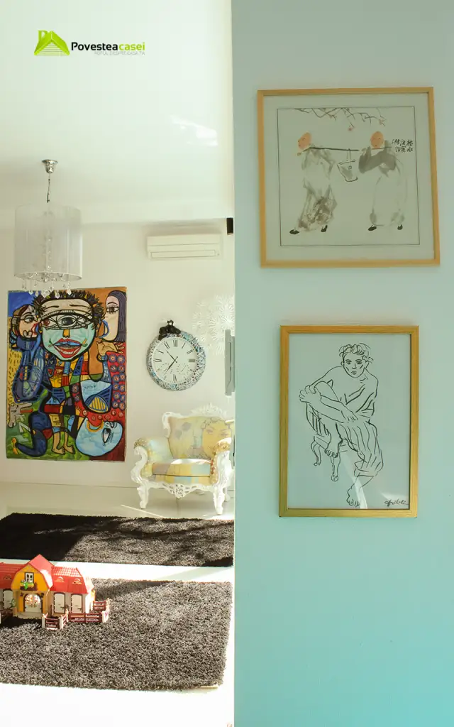 Proprietarii casei sunt mari iubitori de arta contemporana, in special ai pictorilor si graficienilor autohtoni