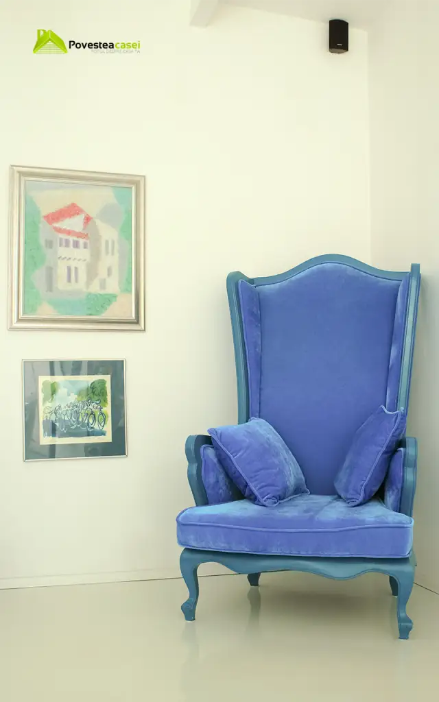 Fotoliul din catifea albastra un liant cromatic intre zona acvamarin si tonurile neutre ale livingului