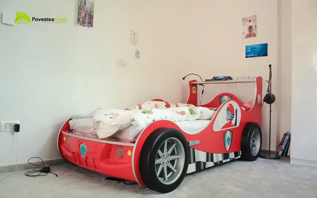 Dormitorul baietelului ne avertizeaza inca de la intrare ca avem de a face cu un pasionat de bolizi de Formula 1, de scrima si de lectura.