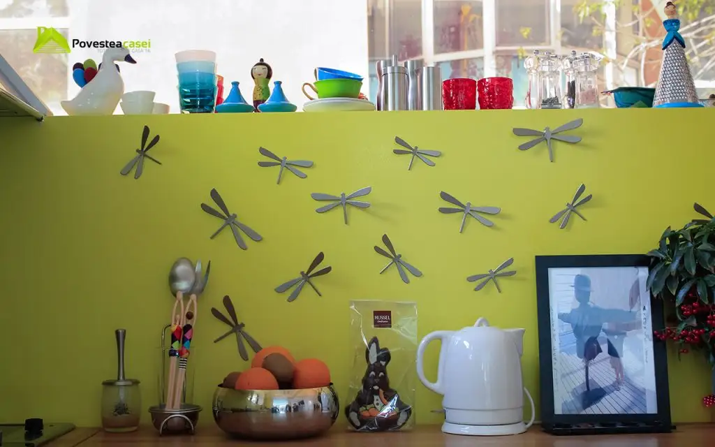 Bucataria, separata prin doua usi glisante imprimate cu fotografiile stilizate ale copiilor, a primit si ea infuzia de culoare – candelabrul fucsia, peretele verde crud intesat de libelule metalice, ustensilele de bucatarie fantezie marca Piu-Piu.