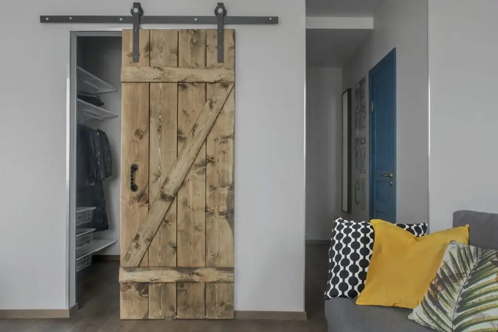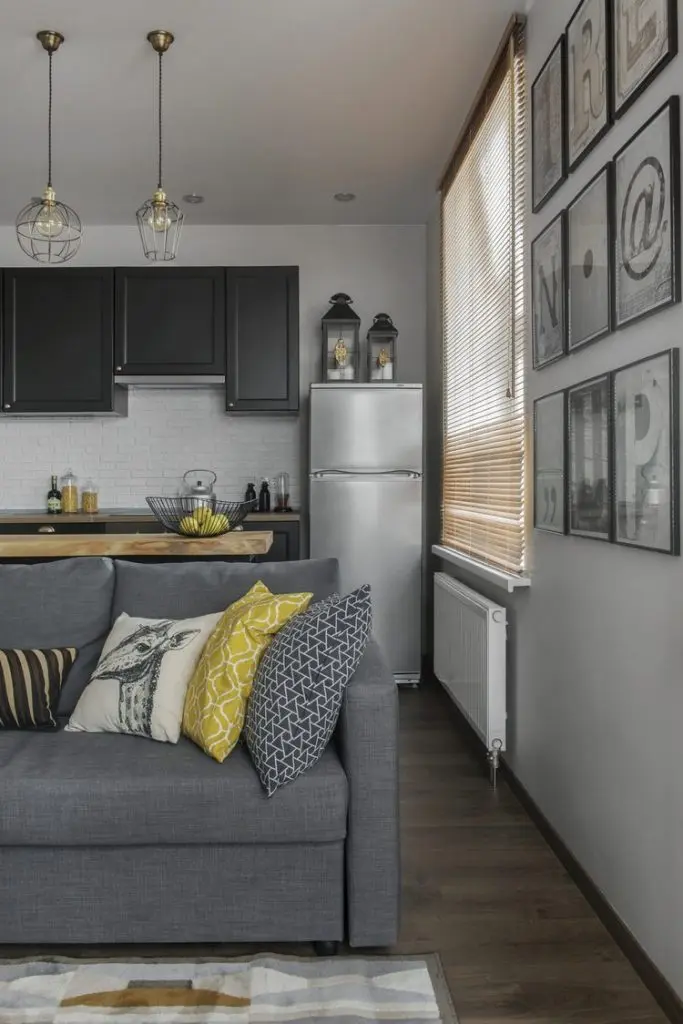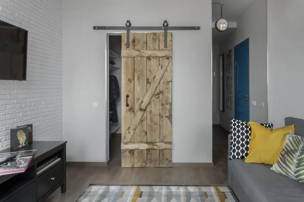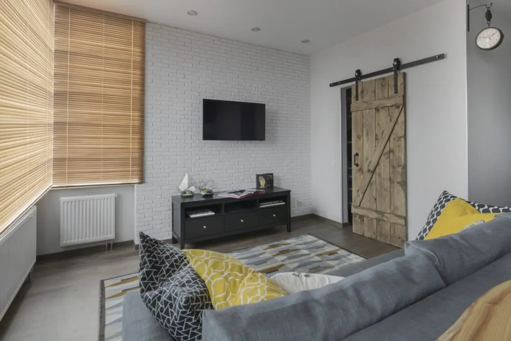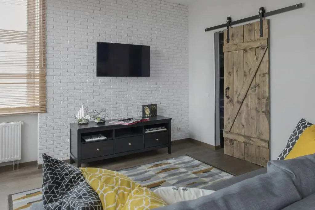 A ales o canapea confortabila si extensibila pentru a putea fi folosita ca pat pentru dormit. In nisa existenta in apartament, a amenajat un dressing incapator pentru haine si alte lucruri voluminoase. Desi, initial gandise o usa obisnuita, batanta cu care sa inchida aceasta mica incapere, a gasit intr-o revista ideea cu o veche usa de hambar, reconditionata si pusa pe sine. Cu ajutorul unui prieten tamplar a reusit sa o aduca la forma existenta si sa o monteze. Textura de lemn brut a usii aduce un plus de stil la nivelul decorului. Comoda si televizorul sunt piesele care intregesc spatiul livingului; covorul si pernele decorative in nuante de gri si galben inveselesc amenajarea.
