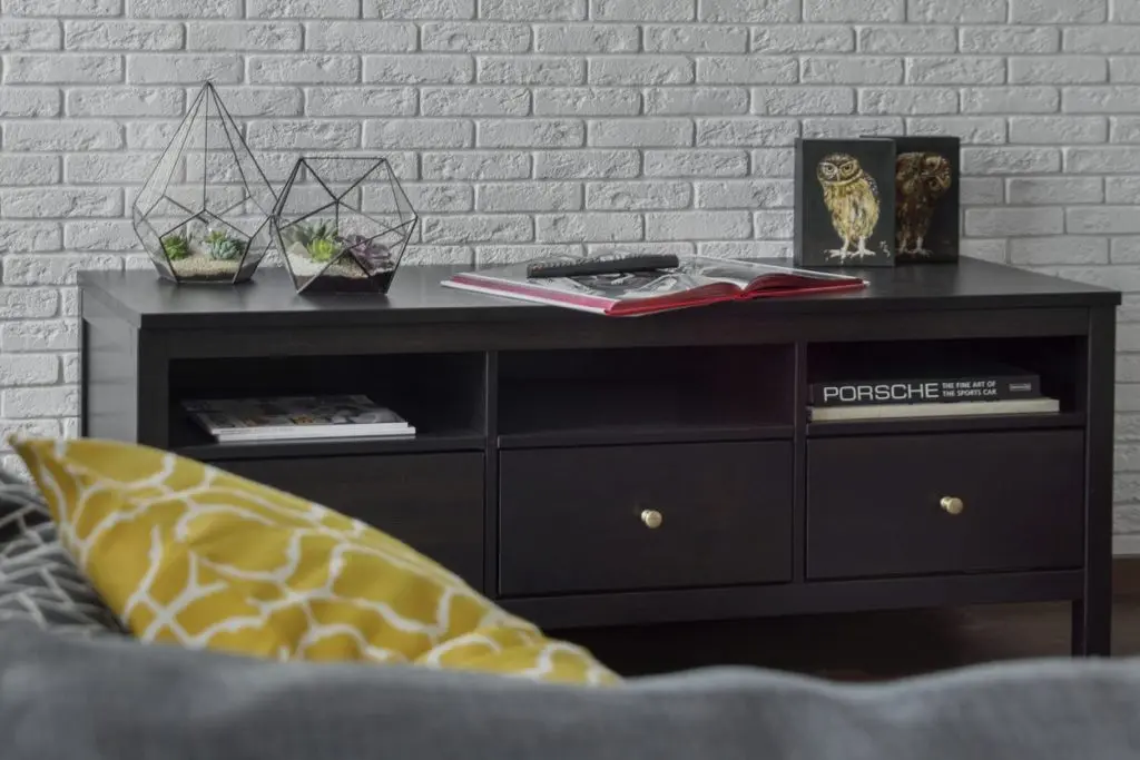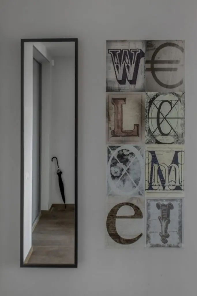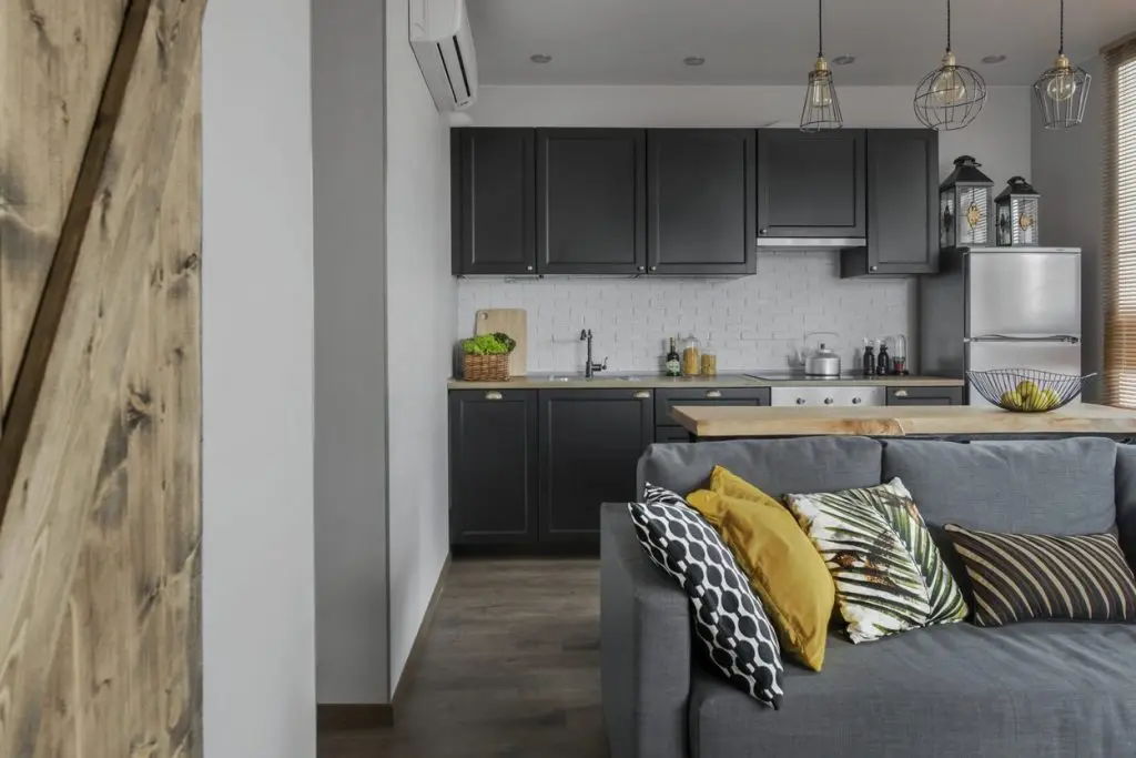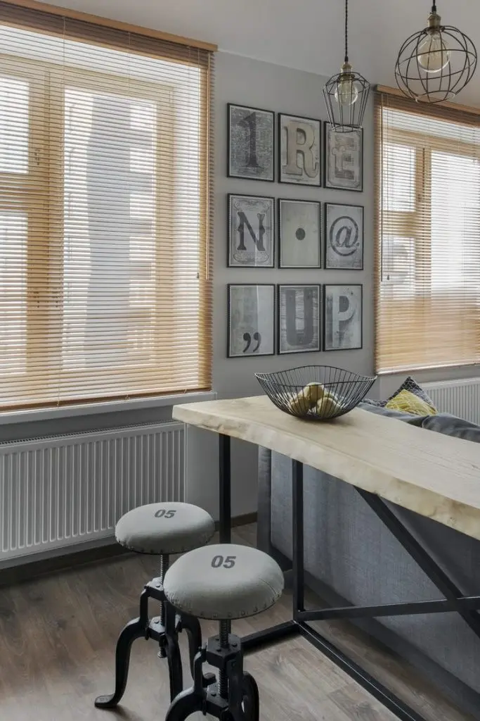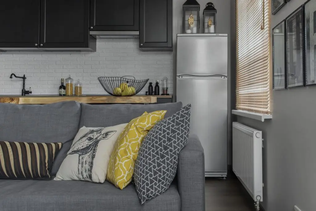A ales o canapea confortabila si extensibila pentru a putea fi folosita ca pat pentru dormit. In nisa existenta in apartament, a amenajat un dressing incapator pentru haine si alte lucruri voluminoase. Desi, initial gandise o usa obisnuita, batanta cu care sa inchida aceasta mica incapere, a gasit intr-o revista ideea cu o veche usa de hambar, reconditionata si pusa pe sine. Cu ajutorul unui prieten tamplar a reusit sa o aduca la forma existenta si sa o monteze. Textura de lemn brut a usii aduce un plus de stil la nivelul decorului. Comoda si televizorul sunt piesele care intregesc spatiul livingului; covorul si pernele decorative in nuante de gri si galben inveselesc amenajarea.