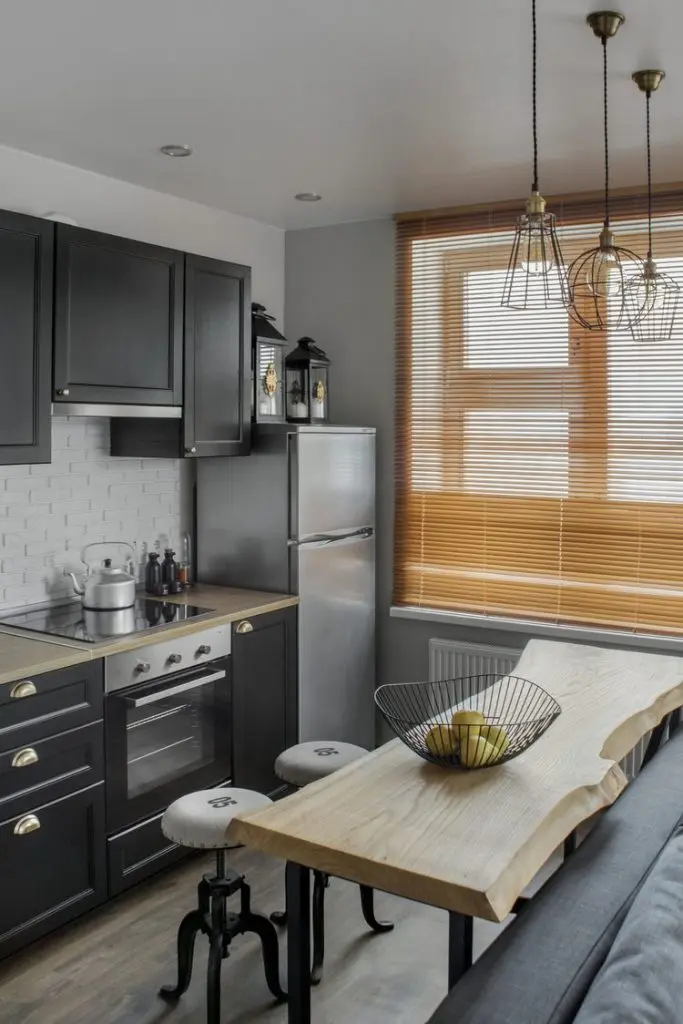 Pentru bucataria open space a ales un mobilier in tonuri mai inchise, dispus liniar, compact. Electrocasnicele sunt incorporate cu exceptia frigiderului. Ca loc de luat masa a gandit o zona de bar. Si acesta a fost creat cu o baza metalica si blat brut in spiritul usii de la dressing. Cele trei corpuri de iluminat suspendate asigura o lumina directa deasupra zonei de mese.