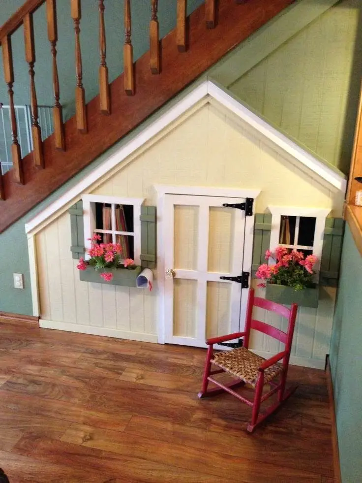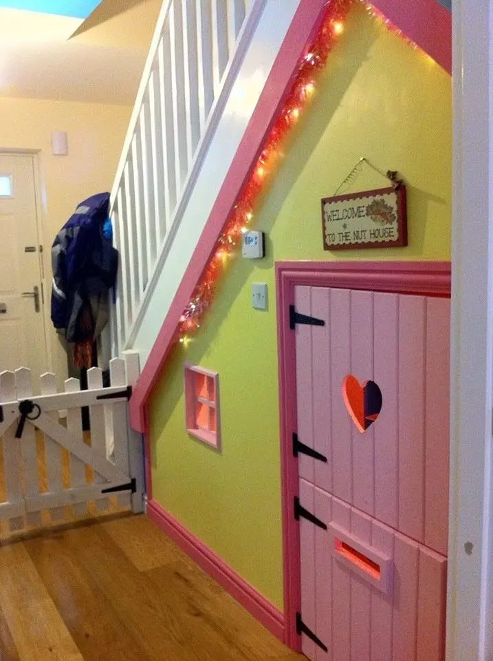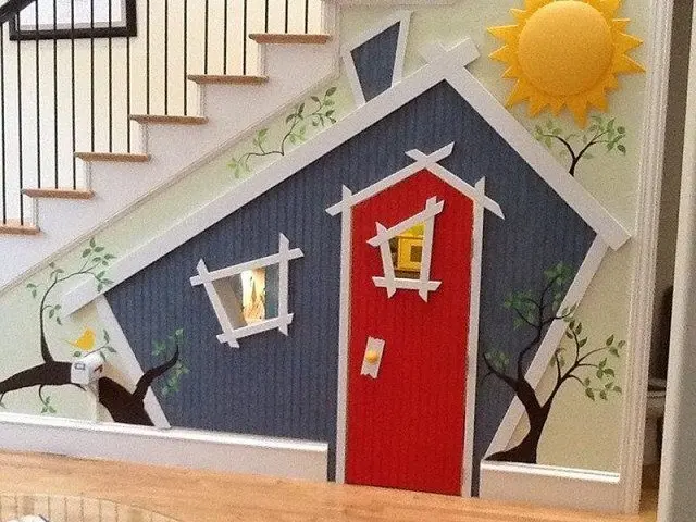 Spatiu de joaca sub scari amenajat ca o casuta din povesti