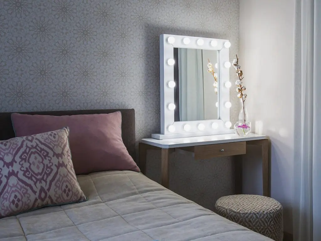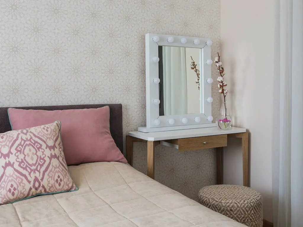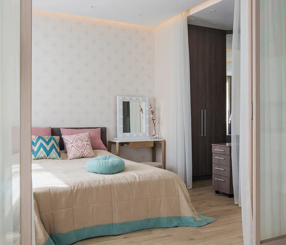 Dormitorul este gandit ca o zona de relaxare, cu paleta cromatica preluata din restul amenajarii. Se pastreaza acelasi tip de draperii din living pentru a sublinia ideea de continuitate intre cele functiuni. Pentru o optimizare a incaperii, noptierele au fost inlocuite cu o comoda de o parte si o masuta pentru machiaj de cealalta parte. Intr-o nisa a fost amenajat un dressing generos, ce poate fi ascuns tot cu ajutorul unor perdele. Imprimeul discret al tapetului completeaza placut ambientul dormitorului.