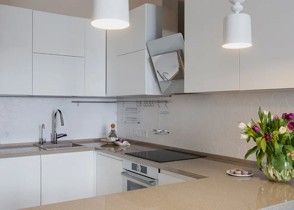 Bucataria in plan deschis asigura toate cele necesare pentru a gati si depozita. Este dispusa in forma de L, cu electrocasnice incorporate si o dispunere optima a zonelor de lucru. Mobilarea este simpla, cu front alb si manere frezate pentru a pastra cat mai luminoasa si unitara aceasta zona a locuintei. Blatul de lucru se prelungeste, formand o a treia latura a bucatariei, folosita ca loc de luat masa.