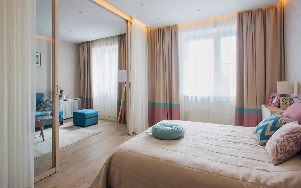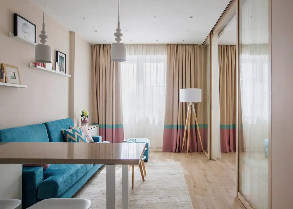 Zona de zi cuprinde bucataria si livingul, iar pentru dormitor, designerul a mizat pe o abordare simpla cu usi glisantecare functioneaza ca partitie intre cele doua functiuni. Usile sunt din sticla astfel ca intreaga camera pare mai spatioasa. Pentru un plus de intimitate, dormitorul a fost prevazut cu perdele in dreptul usilor.