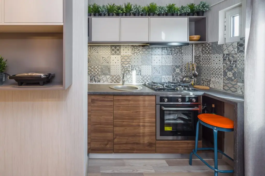 Pentru a eficientiza spatiul, zona de la intrare a fost deschisa catre bucatarie. Aici s-au pozitionat un pantofar, un cuier, frigiderul si un mic loc de depozitare. Mergand inspre bucatarie descoperim un spatiu cu personalitate conturat dupa dorintele celor doi beneficiari. Pe langa zona de gatit si spatiul de luat masa, s-a dorit integrarea a unui dulap suspendat ce functioneaza pe post de bar. Forma atipica a corpurilor de mobilier precum si placile ceramice cu model patchwork dinamizeaza decorul si ii ofera personalitate.