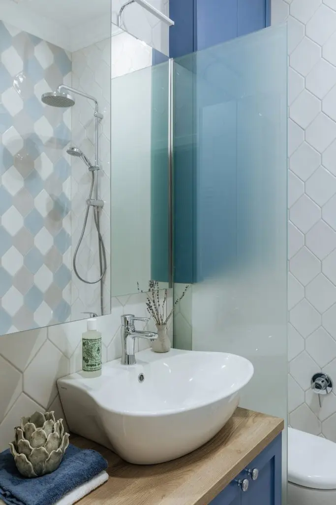 Baia, care la randul ei nu beneficiaza de un spatiu impresionant doar 3.4 mp, reuseste sa ne impresioneze prin organizarea eficienta. S-a reusit integrarea atat a unei cazi cat si a masinii de spalat rufe.