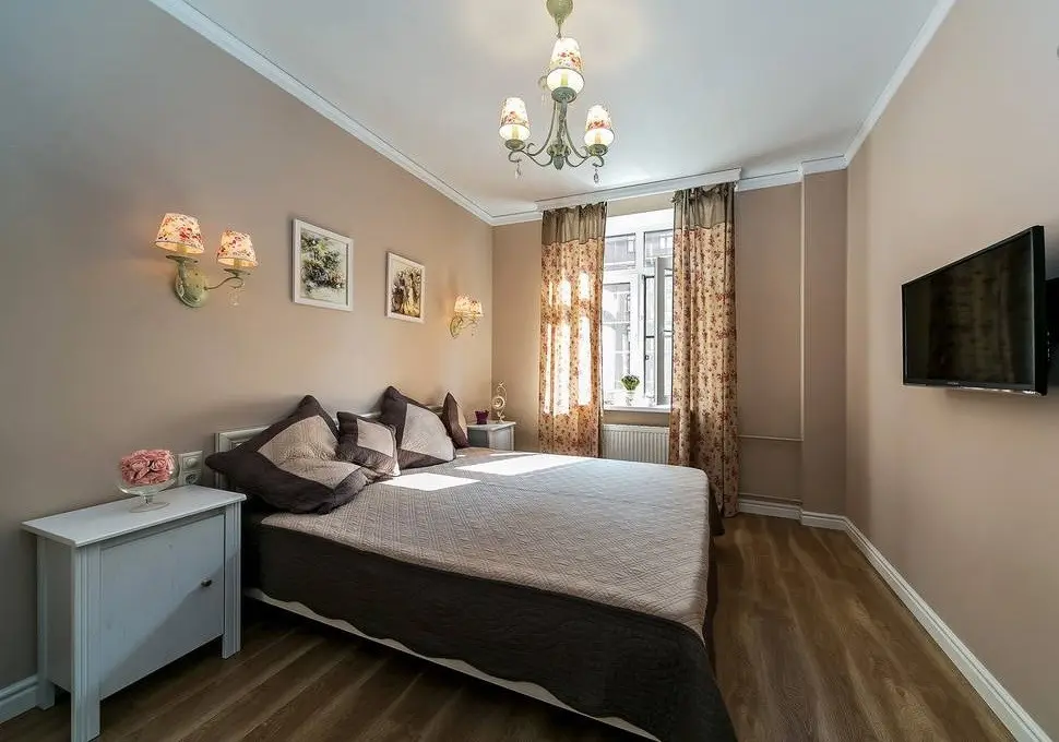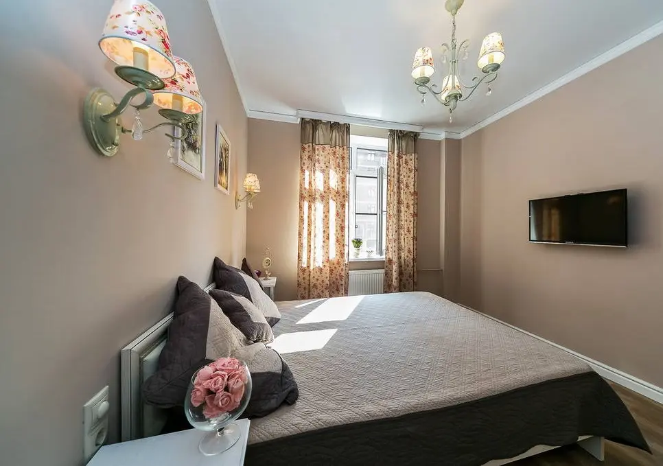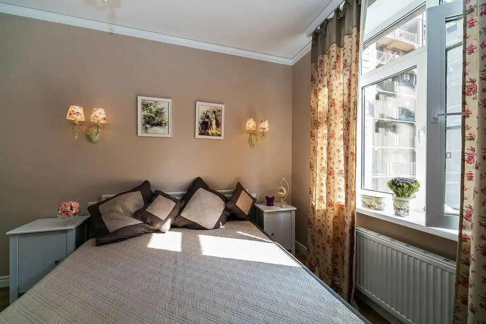 Dormitorul matrimonial contureaza ideea de intimitate si romantism prin pozitionarea centrala a unui pat de dimensiuni impresionante accesorizat in nuantele pastelate cu care deja ne-am obisnuit. Textura florala se gaseste in componenta corpurilor de iluminat si elementelor textile, iar accentele de roz ofera delicatete intregii incaperi, fara a incarca vizual spatiul pus la dispozitie.