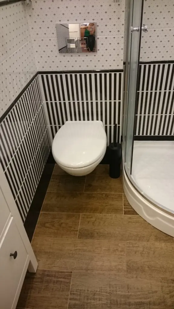 Tapetarea geometrica a baii cu detalii de linii si puncte nu doar ca scoate din anonimat intreaga incapere ci ofera confirmarea ca vorbim despre o amenajare inspirata din locuintele americane. Perfect luminata si marita de folosirea in exces a albului imaculat, aceasta camera devine un loc calitativ, gandit practic si functional.