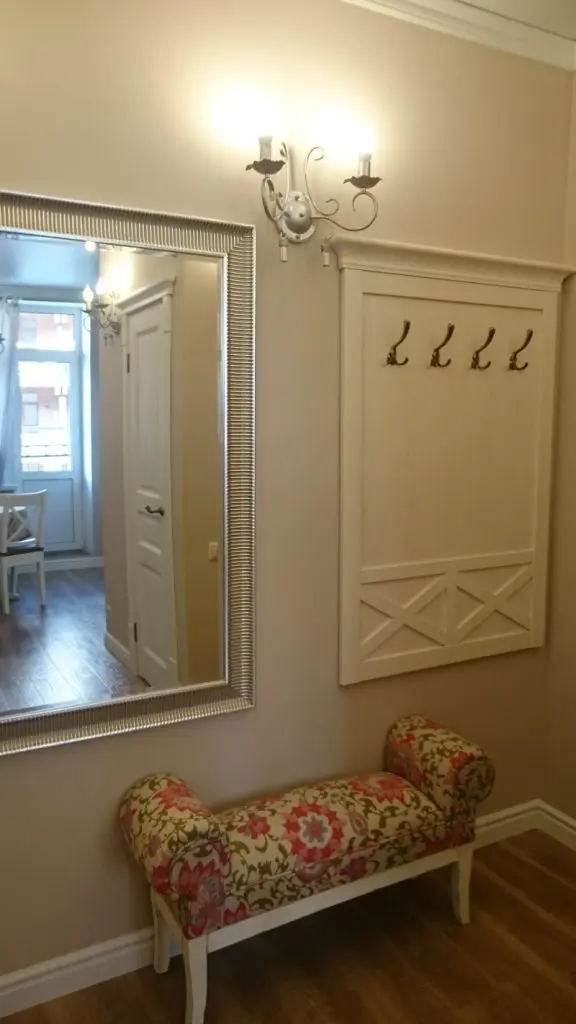 Deschide Galeria Introducerea in povestea americana a acestei amenajari se face inca de la pasirea in interior, unde atentia cade pe introducerea in peisaj a unei canapele inflorate in lateralele careia regasim o oglinda supradimensionata si un curier de perete.