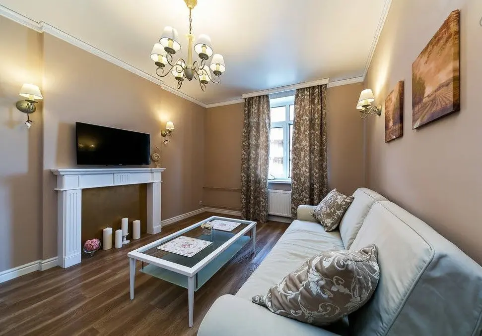 Living-ul se compune dintr-o canapea pozitionata central, un dressing in linii retro, o masa de cafea din sticla si un semineu improvizat, punct de interes al design-ului tipic american. Nuantele predominante sunt pastelurile, griul si auriul, iar pattern-ul draperiei si design-ul corpurilor de iluminat ajuta la accentuarea stilului vintage.