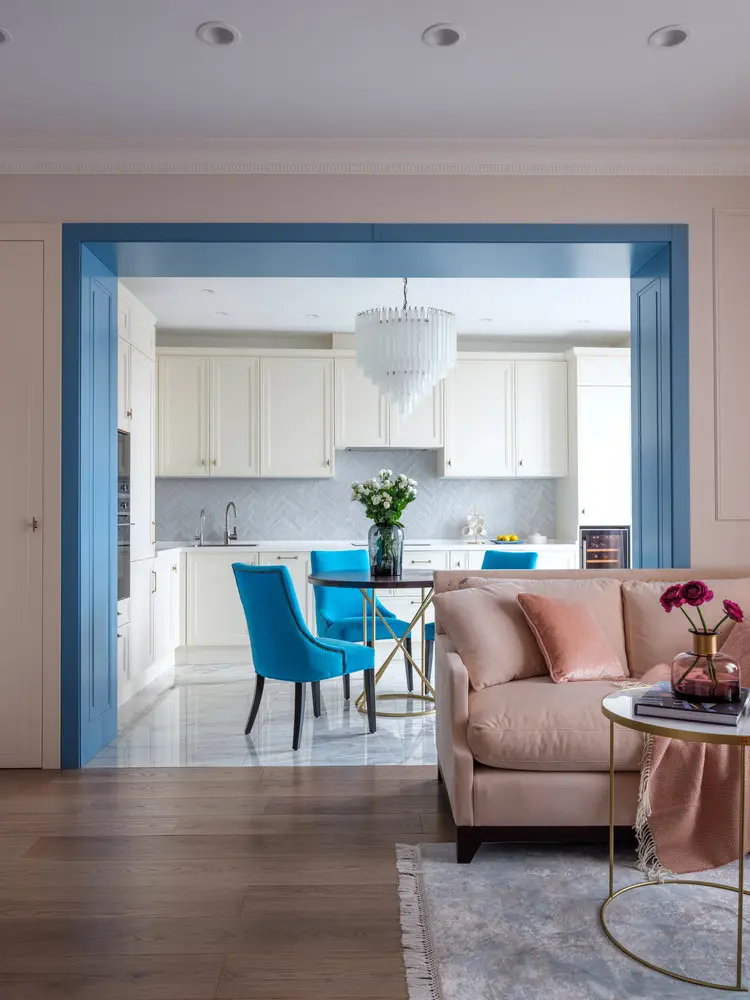 Un detaliu decorativ important, cu un impact puternic la prima vedere, este chenarul din mdf care delimiteaza bucataria de living. Chenarul a aparut in compartimentare din ratiuni tehnice, din dorinta de a masca unul din peretii logiei, structural, cu o grosime de 50 de centimetri, care nu era perpendicular pe peretii de compartimentare nou-creati. Astfel, peretele logiei a fost incorporat intr-un perete mai gros, perpendicular, cu o nisa de trecere intre bucatarie si living, o demarcare discreta a zonelor, din care a reiesit chenarul pe care il putem observa in imaginile alaturate. Acoperit cu profile clasice si vopsit intr-o nuanta de albastru intens, acesta apare ca un portal, o piesa-vedeta in amenajare.