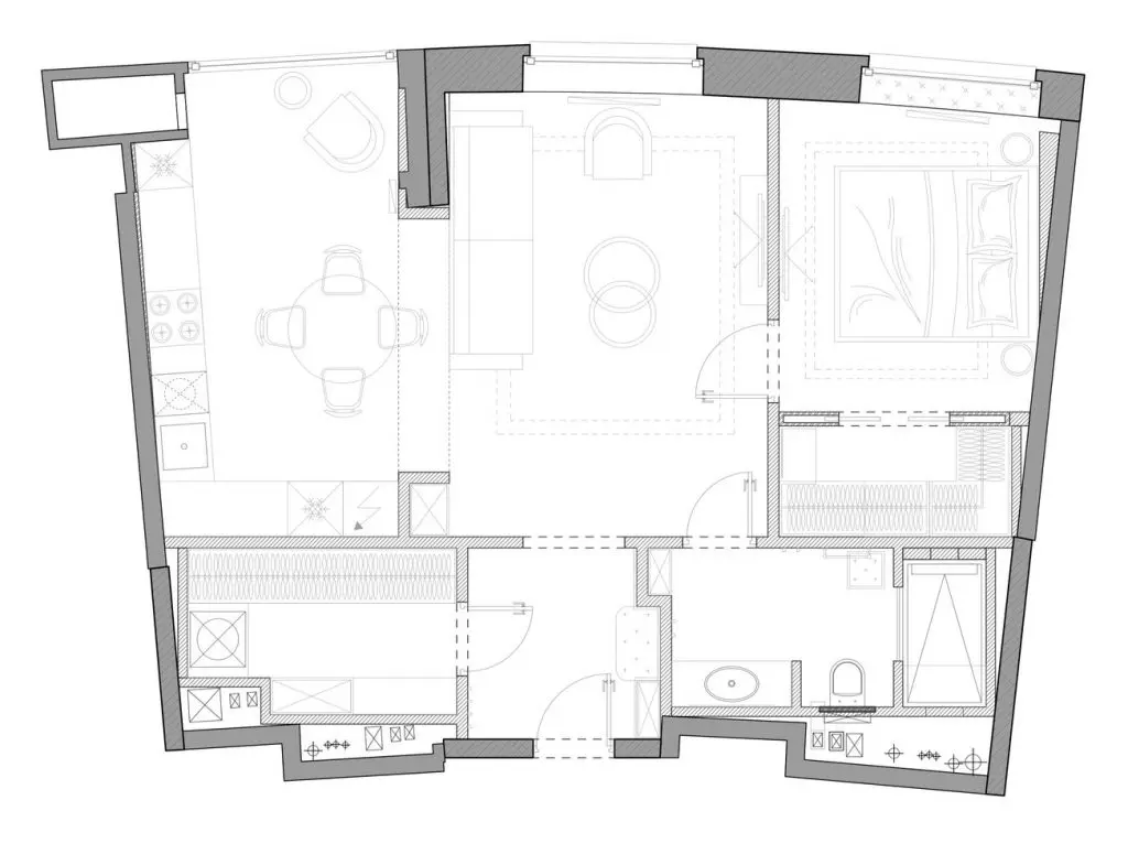 Optiunea pentru traditionalul hol de intrare, lung, a fost respinsa inca din start; a fost aleasa, in schimb, impartirea spatiului intr-un hol de intrare de forma patrata, mai mic, rezultand un dressing aditional, spatios, in care este amplasata si masina de spalat rufe si totodata, au putut fi alocati zonei de living cativa metri patrati in plus. La nivel de compartimentare, logia din planul initial a fost inchisa si integrata in suprafata totala a apartamentului. Datorita acestei decizii, bucataria a devenit un spatiu generos si luminos, care beneficiaza de o fereastra panoramica ce contribuie la creionarea unei atmosfere calde, placuta.