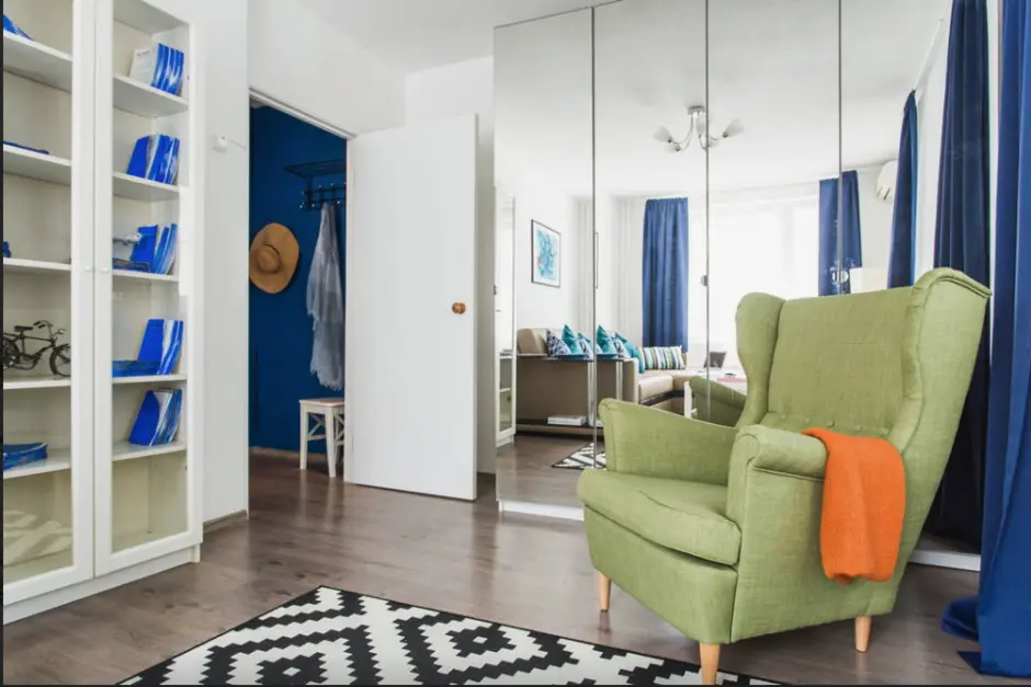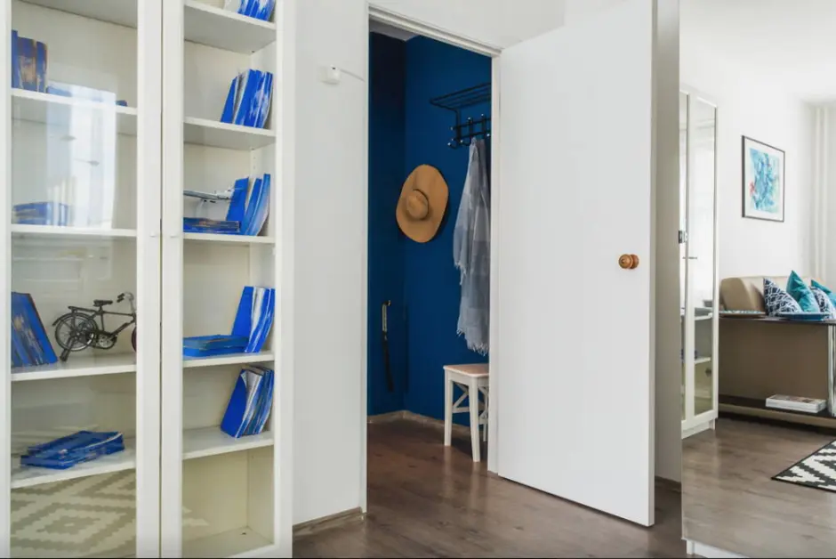 Dulapul cu usile din oglinzi reflecta lumina si creeaza iluzia de largire a spatiului, un truc de folosit in orice spatiu mic. Pe hol, usa de la camara a fost inlocuita cu un model tip oblon, tot alb. Contrastul alb-albastru aminteste de decorurile mediteraneene.
