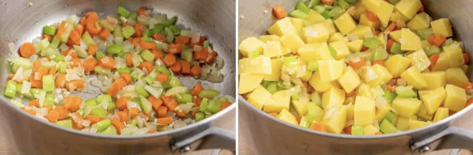 Adaugă cartofii și supa de legume. Fierbe până când cartofii sunt fragezi.