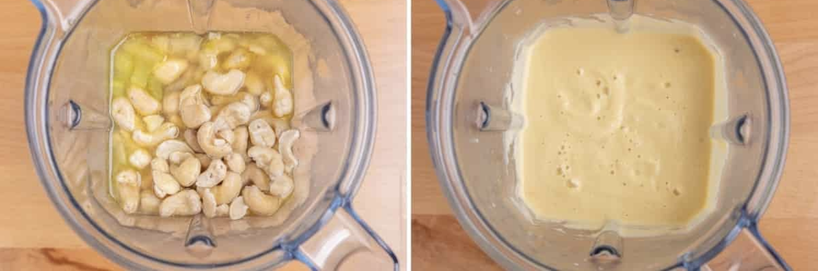 Scoate cartofii fierți și pune-i în blender împreună cu caju-ul înmuiat și o cană de apă. Blenduiește până obții o cremă fină. Ajustează consistența cu mai multă apă dacă este nevoie.