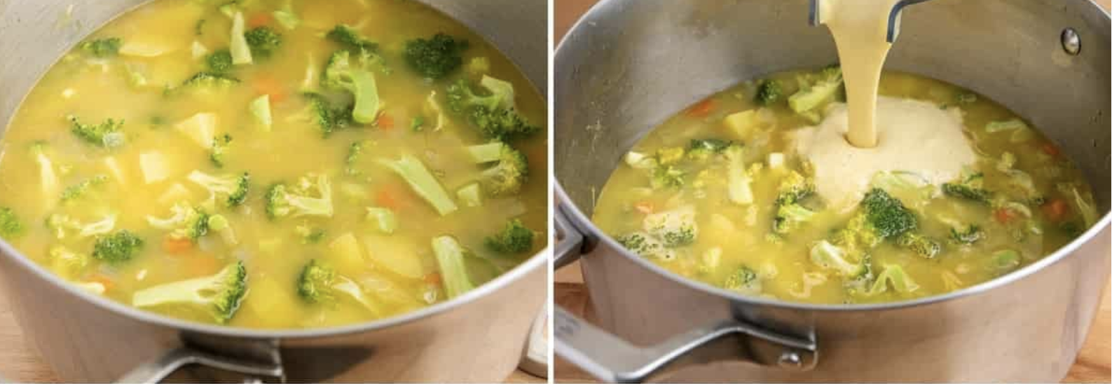 Adaugă broccoli-ul și morcovii în supa lichidă împreună cu condimentele (drojdia nutrițională, pudră de ceapă, pudră de usturoi, paprika). Fierbe aproximativ 5 minute până legumele sunt fragede.