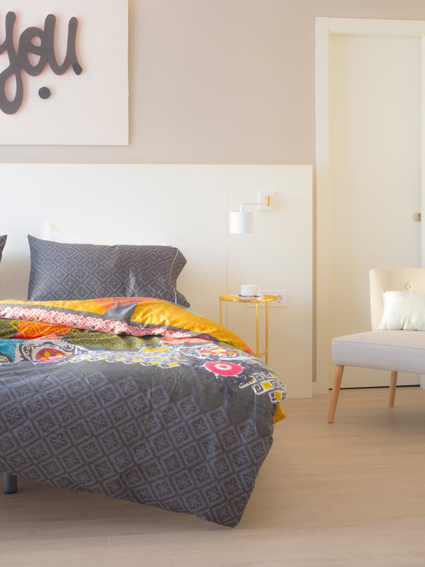 Vrei sa obtii un aer contemporan? Foloseste pe post de noptiera o masuta de un verde menta (lasa sa se vada lemnul din picioarele masutei). Tablia de pat capitonata este de mare efect aici.