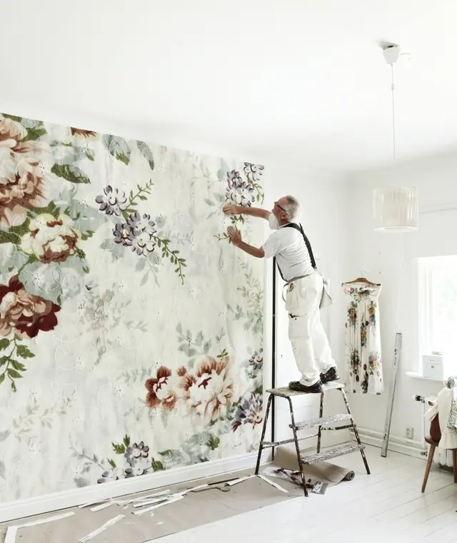 Inainte de aplicarea tapetului se curata peretii si se aplica un adeziv special pentru tipul de tapet ales