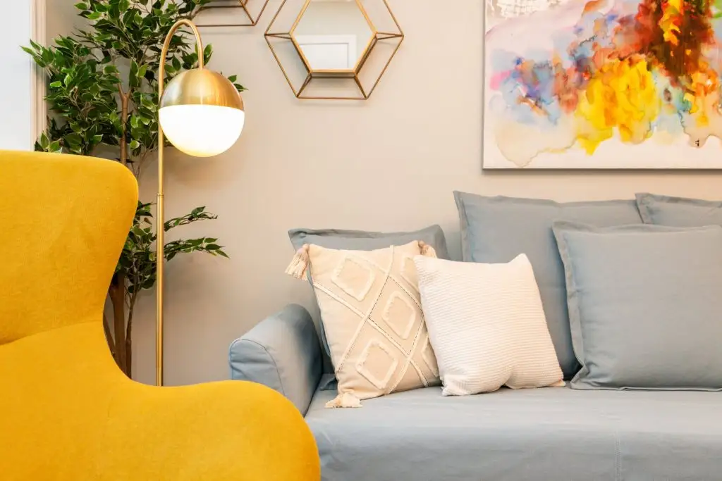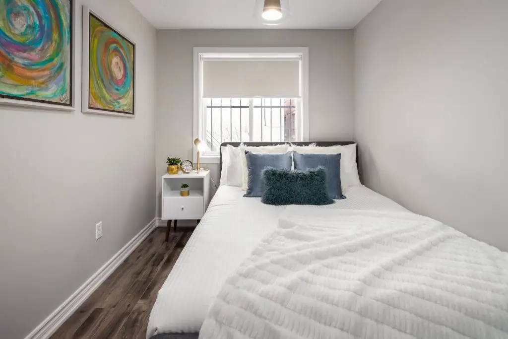 In cazul dormitoarelor, pentru ca vorbim de o suprafata restransa, mobilierul se compune din paturi duble insotite in lateral de noptiere inguste. In ceea ce priveste transformarea vizuala, se apeleaza la nuante de gri, detalii de auriu metalic, si culori vii precum galbenul si orange-ul.