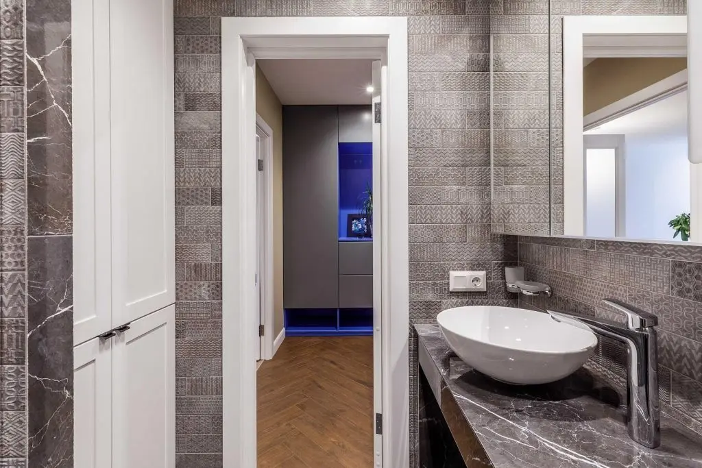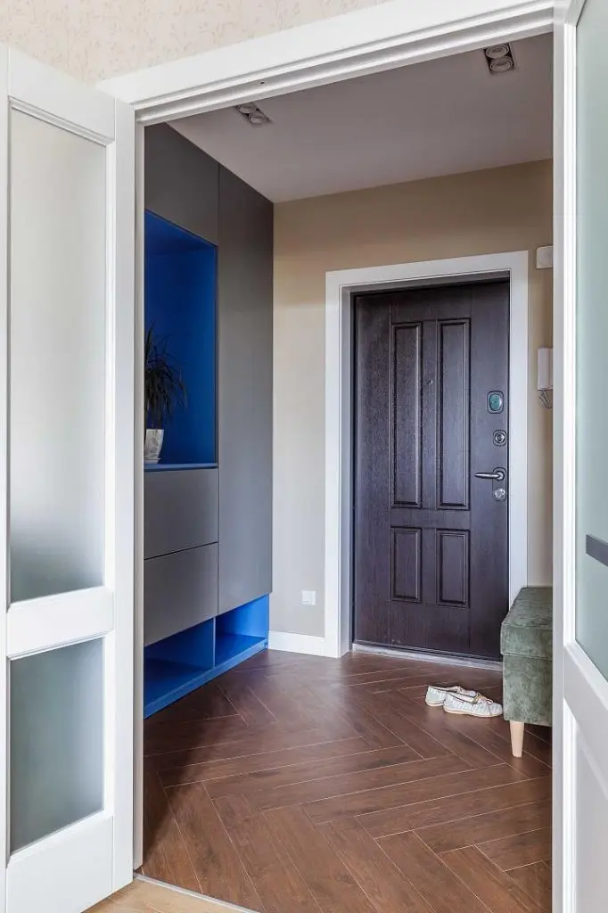 Dulapul incastrat din holul de intrare a fost realizat din mdf vopsit intr-o nuanta calda de gri, fara manere, in care au fost inserate goluri finisate cu o nuanta intensa de albastru.