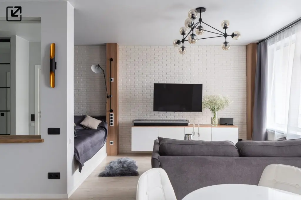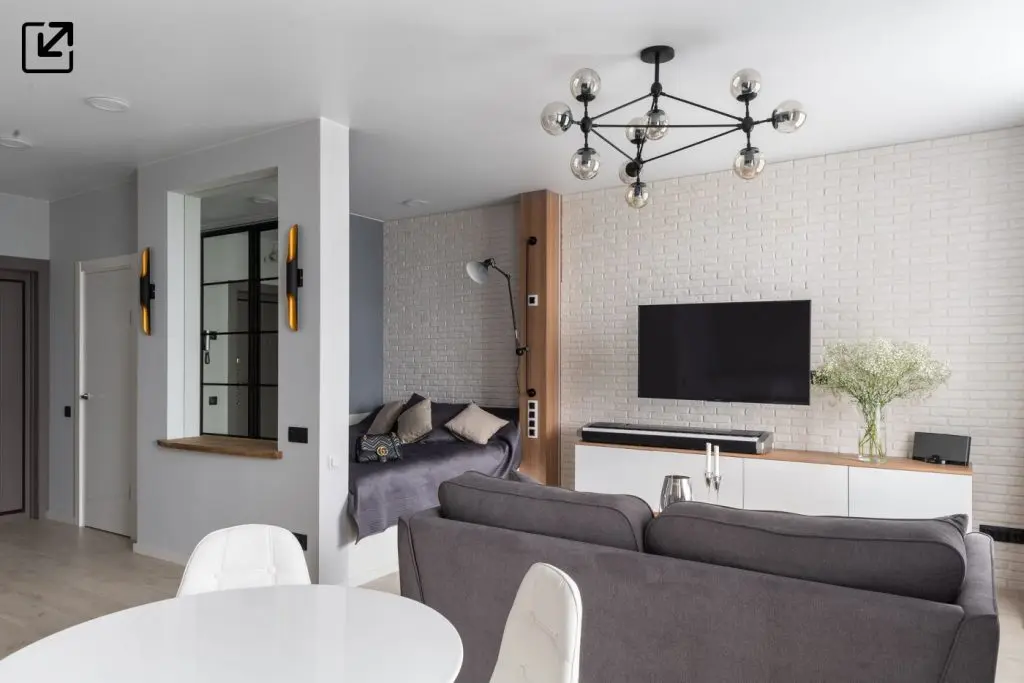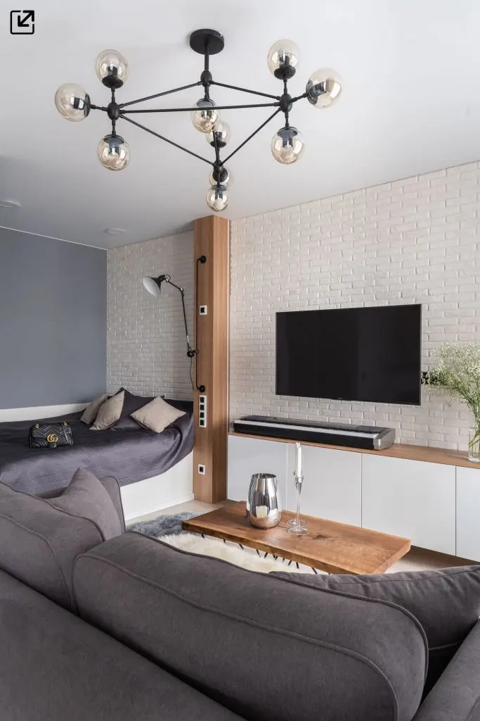 Living-ul ocupa aproximativ jumatate din open space, fiind separat de bucatarie prin locul de luat masa. Dispunerea centrala a canapelei de doua locuri asigura o separare discreta a acestor zone. Cel mai mare perete din casa, peretele media (cu consola si tv) este placat cu tapet cu textura de caramida alba, care insufla amenajarii un aer industrial, impreuna cu lampa suspendata din living, aplicele de perete din hol si lampa reglabila de la pat. Regasim nuantele de alb lucios si la mobilierul din living, compus dintr-o consola minimalista cu patru usi de tip push, fara manere, cu blat din lemn de stejar.