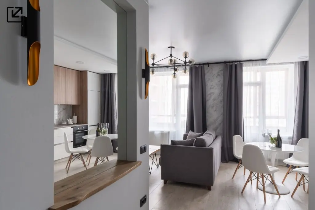 Luand in considerare preferintele proprietarilor si dimenisunile reduse ale spatiului, amenajarea este in stil scandinav cu accente vintage-industriale. Predomina nuantele deschise ale finisajelor, in contrast cu accentele de lemn si griuri calde ale mobilierului. Astfel intregul spatiu pare mai luminos si amplu. La iluzia optica a unui spatiu mai mare au contribuit si oglinzile amplasate pe mobilierul din hol si oglinda incastrata in nisa de pe peretele opus.