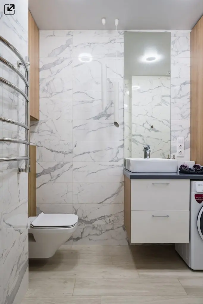 Baia continua linia stilistica a zonei de zi, fiind placata cu marmura Calacatta si gresie cu aspect lemn stejar albit. Stereotomia peretelui din dus, placat cu gresie aspect parchet confera unicitate spatiului, inversand dispunerea traditionala a finisajelor perete-pardoseala. Zona dusului este delimitata de restul baii printr-un podest in care este integrata rigola de scurgere, solutie eficienta in cazul in care inaltimea spatiului nu va permite sa aduceti intreaga pardoseala la acelasi nivel.