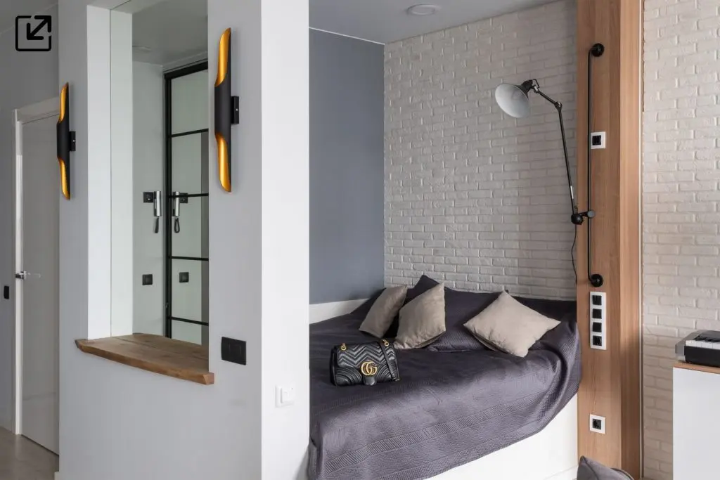 Particularitatea amenajarii o constituie abordarea neconventionala a dormitorului. Patul dublu este incastrat intr-o nisa delimitata de peretele cu caramida alba si peretele cu oglinda din hol, rezolvare ce a economisit mult din spatiul apartamentului.