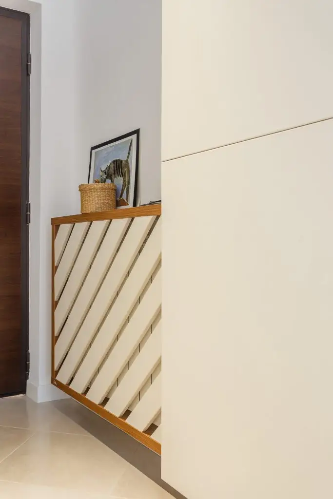 Zona de relaxare este extrem de luminoasa, iar folosirea beige-ului, albului si lemnului natural in nuante de ulm si nuc, dau caldura si naturalete. Pentru ca s-a dorit conturarea unei senzatii de plutire in armonie a tuturor elementelor, corpurile de mobilier sunt suspendate mural, asa cum se poate observa in cazul bibliotecii sau a pantofarului.