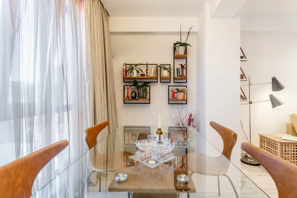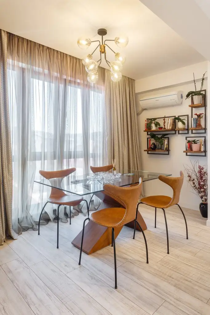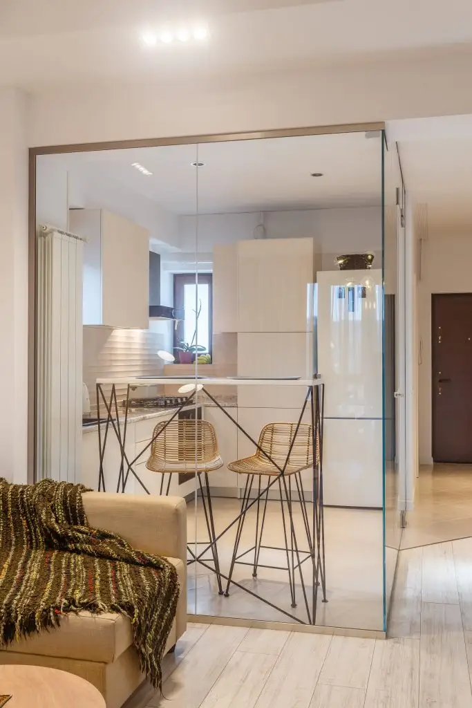 Delimitarea rolurilor celor doua camere se face intr-o maniera nonconformista. Spatiul de pregatire si servire a mesei isi regaseste unitatea si unicitatatea in aceeasi masura, separandu-se cu ajutorul sticlei: o optiune moderna de a pastra legatura celor doua incaperi dar si de a izola fonic si olfactiv.